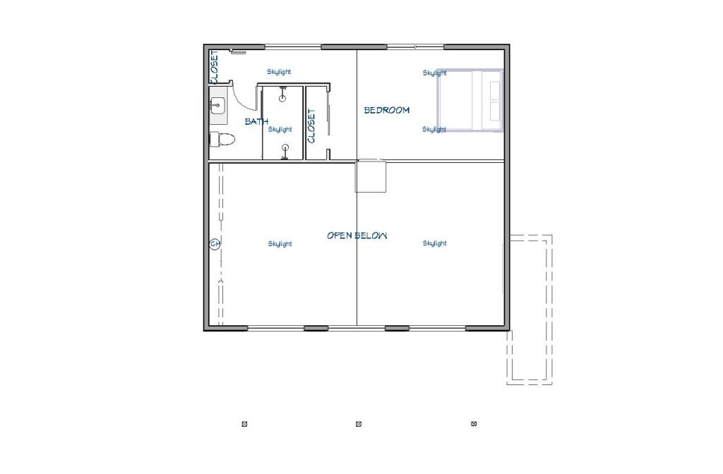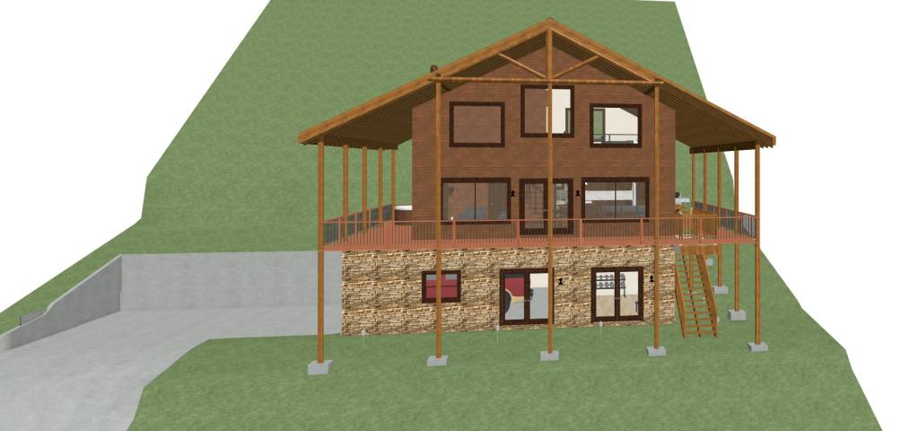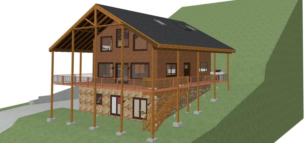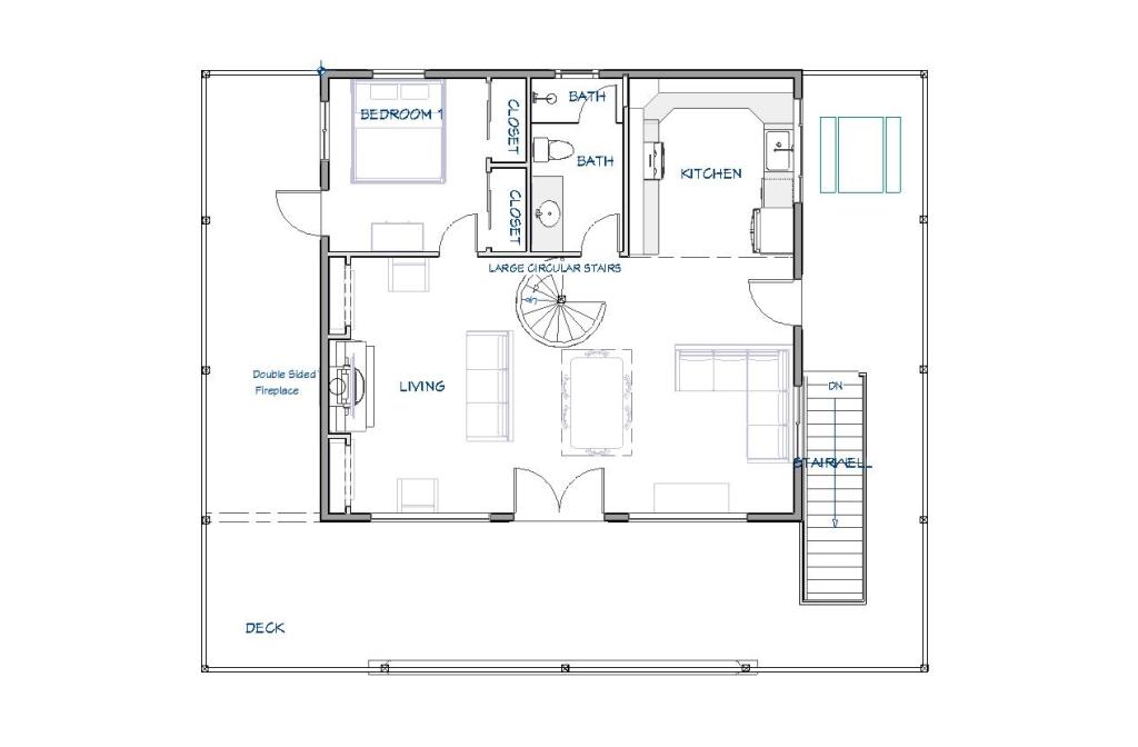 An exterior stair case that is completely covered from weather leads you to the front door where you walk into an open concept living space with tall ceilings, timber beams and a tall fireplace on the far wall. A bathroom and bedroom with ample closet space gives a guest a nice place to stay as well as plenty of storage. The bedroom leads out to the covered deck that wraps around 3 sides of the home. Big enough to fit a hot tub on