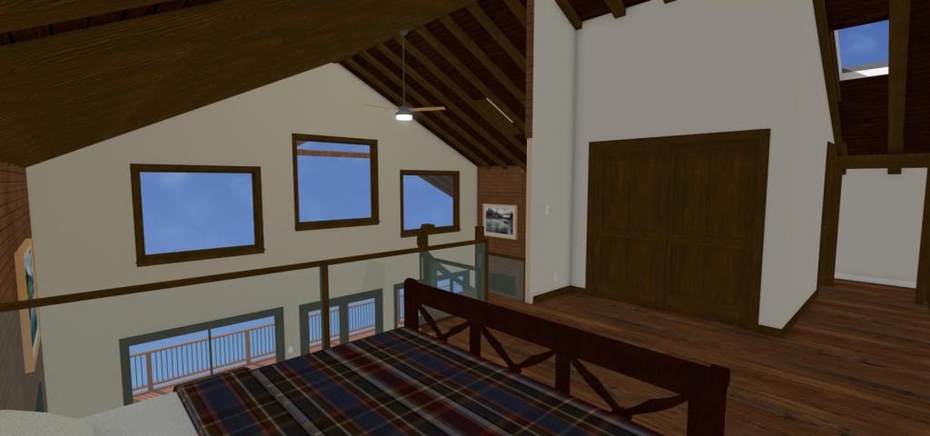 Going up a spiral staircasre to a loft bedroom that overlooks the living space gives a rich open concept This bedroom has 2 closests and a bathroom with a large walk in shower.